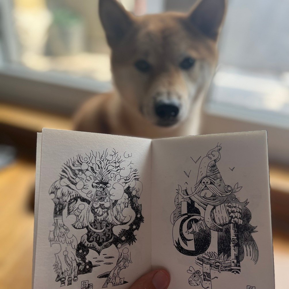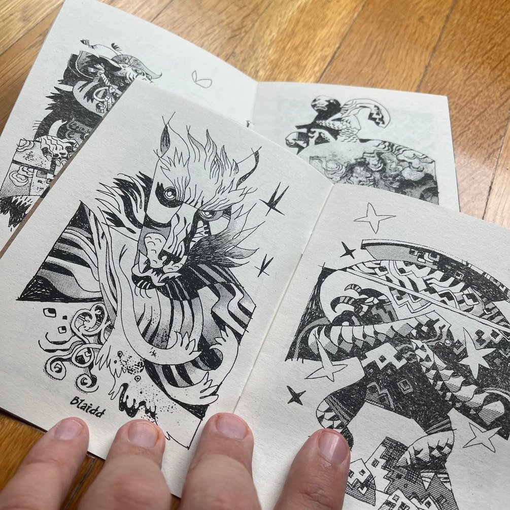 4.1×5.8 inches book with 24 black and white drawings inside. Printed on recycled paper with risograph, available with limited edition cover colors.